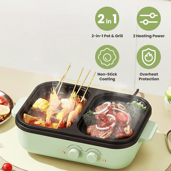 Home > 2-in-1 Electric Hot Pot & Grill Combo, Dual Separate Temperature Control, Non-Stick Die-Cast Aluminum, Overheat Protection