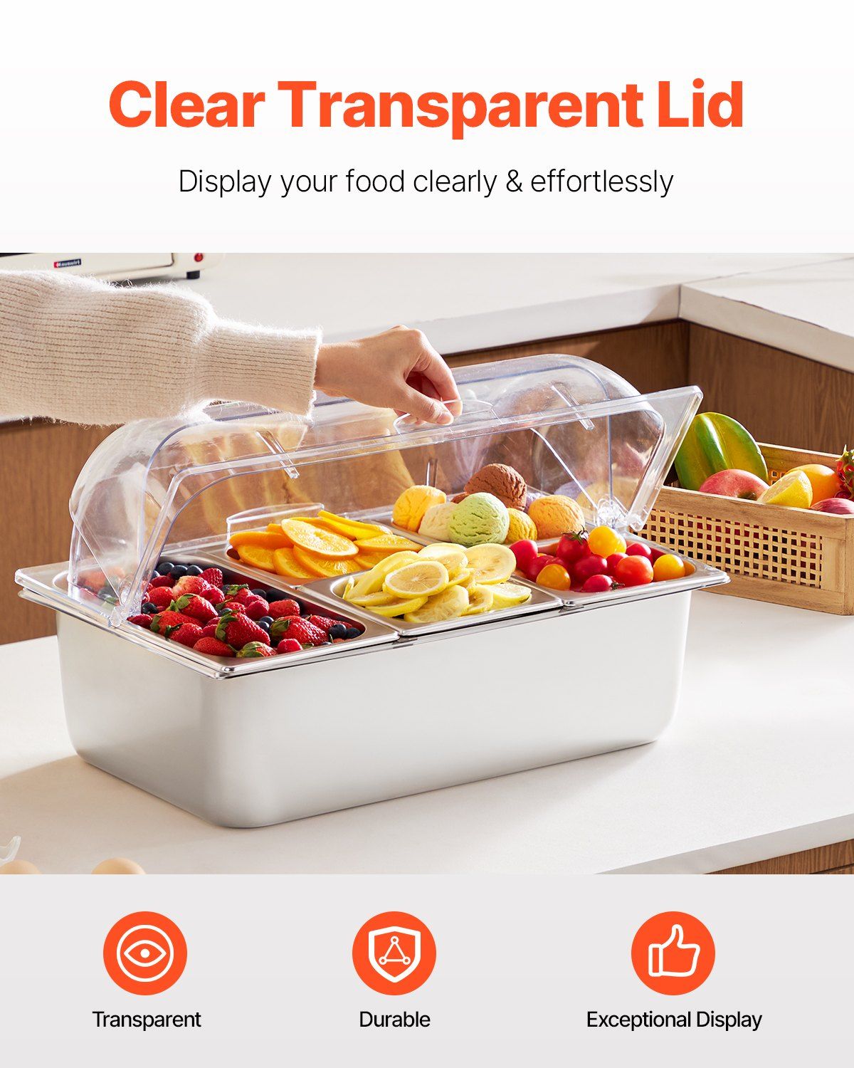 2.Clear Top Lid: Our ice cooled food display rack delivers a clear lid made from tough PC material to let you easily view your delicious food while providing easy access with the roll-back design. It also seals tightly to keep out dust, making it ideal for food storage and display
