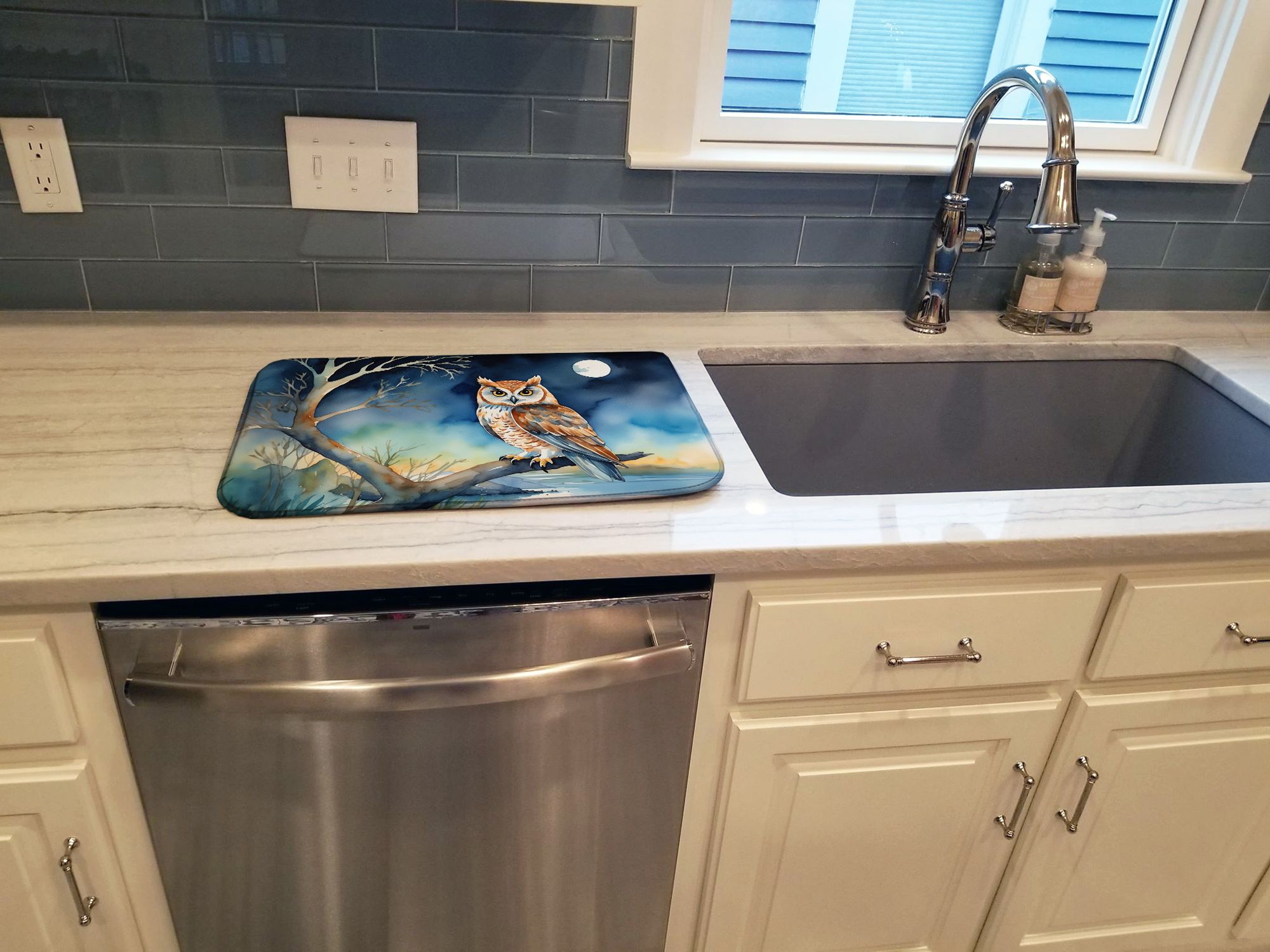 Dish Drying Mat featuring breed specific Owl artwork. Say goodbye to messy countertops and soggy dish towels with our innovative dish drying mat. Our high-quality dish drying pad is designed to keep your countertops dry while offering a stylish and efficient solution. Whether you're air drying dishes, glasses, stemware, silverware, pots, pans, bottles, or even fruits and vegetables, our dish mat is the perfect choice. The 14 inches x 22 inches size fits most counters and dish drying racks, and the non-slip design ensures stability. Made with water-absorbent polyester and a polyurethane foam insert, our dish drying mat is not only functional but also durable. It's machine washable and printed in the USA for long-lasting use. The beautiful artwork adds flair to your kitchen decor, making it a perfect housewarming gift or present for any occasion. Upgrade your kitchen experience with our absorbent and versatile dish drying mat.