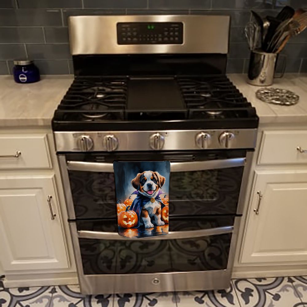 Kitchen Towel featuring breed specific Saint Bernard artwork. Celebrate Halloween with this Halloween Kitchen Towel. Experience the perfect blend of aesthetic appeal and functional excellence with our Plush Velour Kitchen Towels. These are not your ordinary decorative kitchen towels that gather dust. Instead, they are designed to be as practical as they are stylish. The front layer of our towel is constructed from a minky plush polyester, known for its durability and color retention. Unlike conventional kitchen towels, the artwork on our towels is dyed directly into the fabric, ensuring vibrant colors that last. Polish your glassware to a brilliant sparkle using the plush front side of the towel. Flip to the back, crafted from 100% cotton terry loop, to exploit its exceptional absorbency for drying dishes or wiping down counters. Our kitchen towels redefine the concept of functional art, offering lasting quality that maintains the towel's shape over time. Measuring 15 inches by 25 inches and weighing 2.3 lbs per dozen, these towels deliver an overwhelming sensory experience with their soft, plush, and smooth texture. The edges are meticulously finished with binding, enhancing their durability and visual appeal. For your convenience, these towels are machine washable and can be dried on low heat. After the first wash, the top fabric becomes even softer and fluffier, eliminating the need for ironing. Treat your kitchen to the luxury and functionality it deserves with our plush velour kitchen towels.