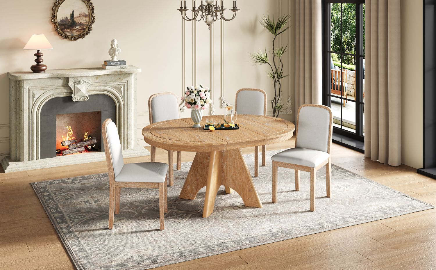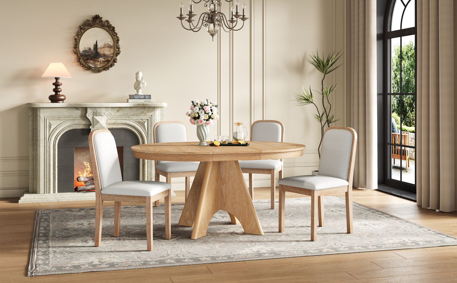 Nostalgic Elegance with Vintage Warmth: This vintage-inspired dining set brims with mid-century retro charm. Crafted from solid wood in a distressed finish, it pairs with retro linen upholstery seats. The table features practical extendable performance, while chairs offer cozy comfort. It radiates a nostalgic vibe for various spaces in 2 colors, Natural Wood Wash and Espresso, with curved edges, wood grain and subtle hardware making it a retro statement piece of classic appeal.